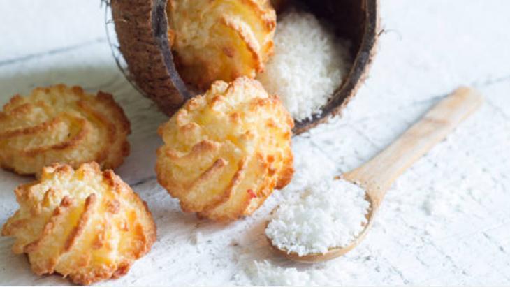 Fırınınızı 175 dereceye ayarladıktan sonra o ısınana kadar bir kâsede yumurta beyazı, şeker ve tuzu mikserle yaklaşık 2 ila 3 dakika çırpın. Ardından, Hindistan cevizi rendesini ekleyin ve tüm malzemeleri iyice karıştırın.